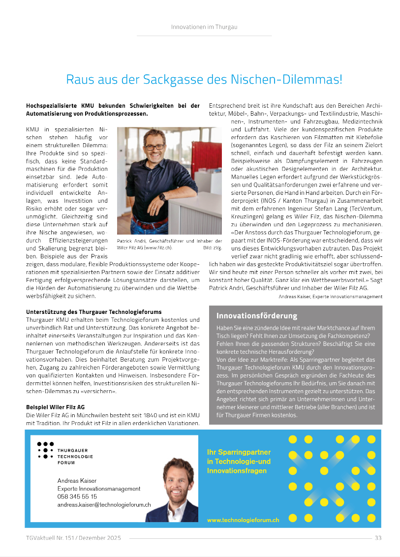 «Der Impuls des Thurgauer Technologieforums und die INOS-Förderung gaben den Ausschlag. Trotz Herausforderungen übertraf das Projekt die Produktivitätsziele und schuf einen klaren Wettbewerbsvorteil.» Patrick Andri, Geschäftsführer und Inhaber